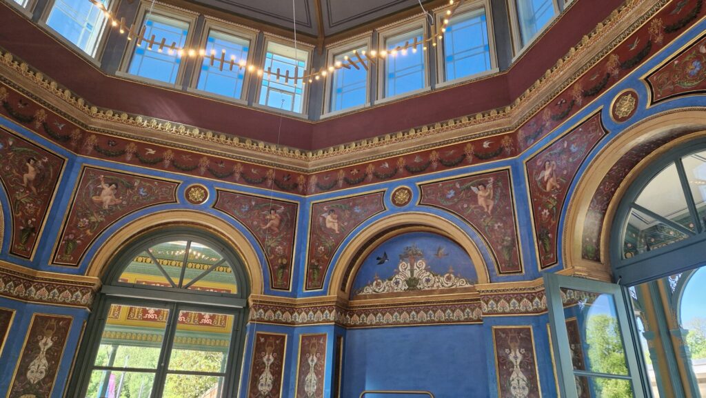 Damit der Pavillon in neuem Glanz erstrahlen konnte, musste u. a. die komplette Gusseisenkonstruktion abgebaut, in der Werkstatt instandgesetzt, neu beschichtet und wieder aufgebaut werden. Auch die beeindruckenden Wandmalereien im Innen- und Außenbereich sowie der Sandstein wurden gereinigt, konserviert und restauriert.